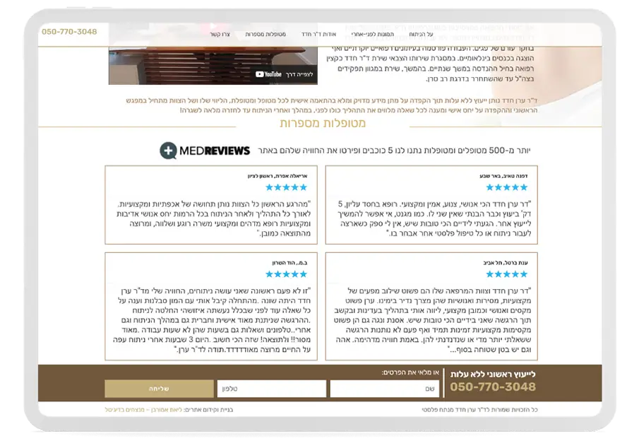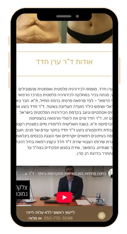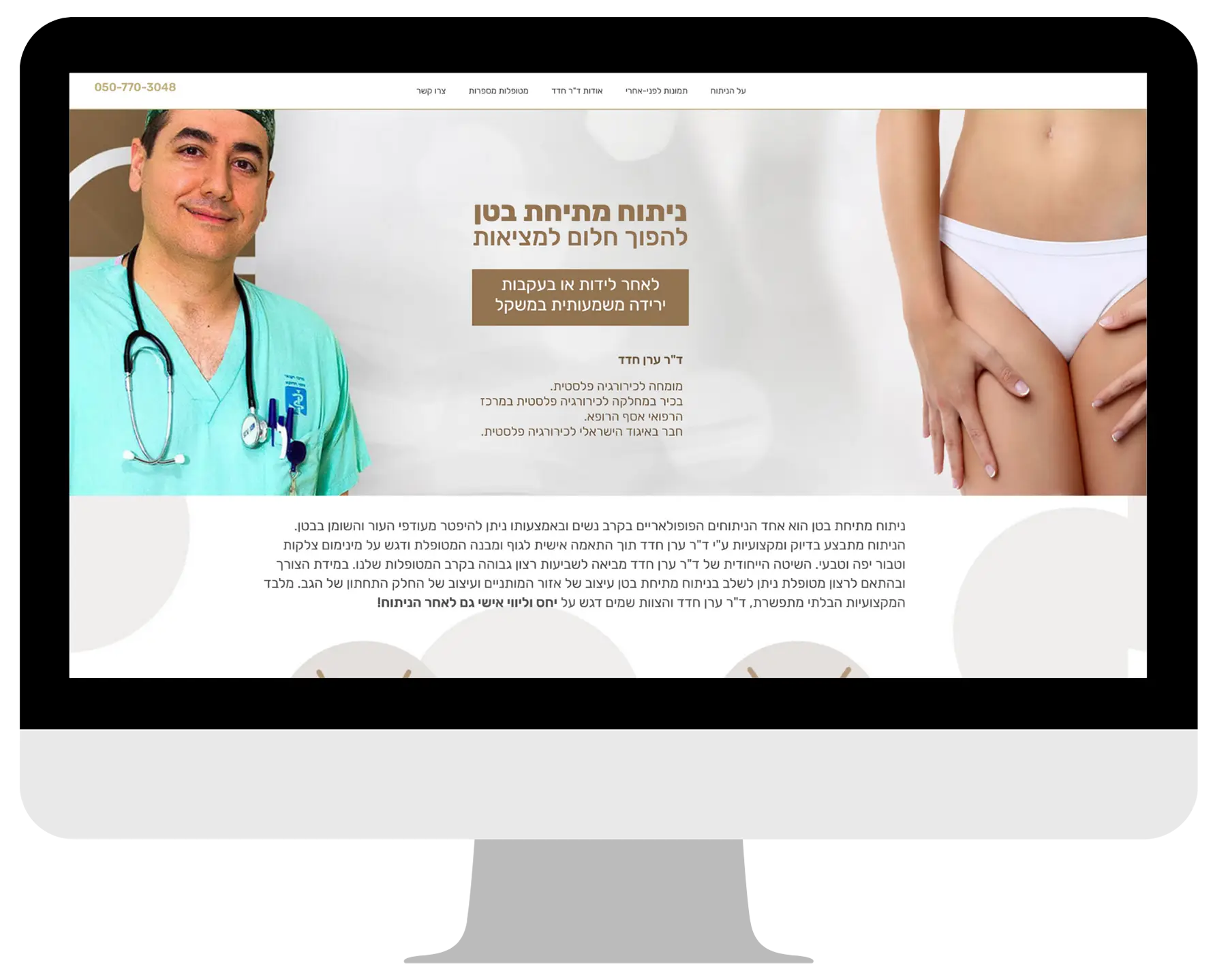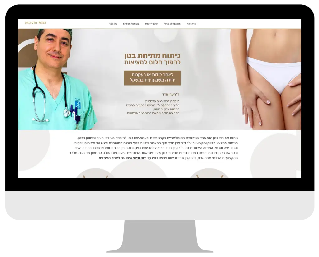 בניתוח מתיחת בטן אין מקום לפשרות – ולכן יצרנו עבור ד"ר ערן חדד דף אינטרנט שהוא ממש תהליך שלם. אתר One Page מדויק שמוביל את הגולשת שלב־אחר־שלב: מהיכרות עם הרופא וניסיונו, דרך הסברים רפואיים בגובה העיניים, ועד תחושת ביטחון שמובילה לפנייה לייעוץ אישי.
