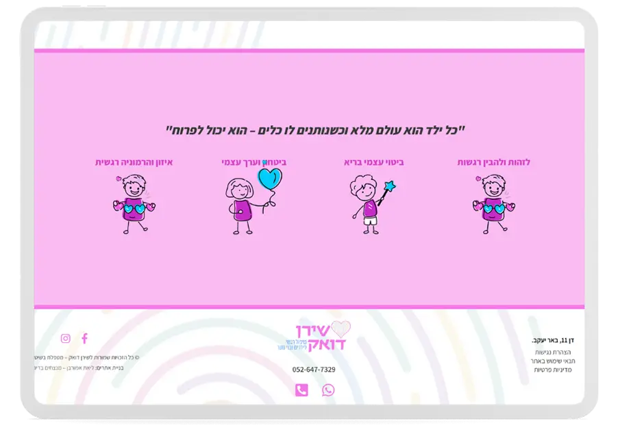 משם המשכתי עם עיצוב רך, צבעוני ונגיש – שמשלב איורים ידידותיים, משפטי השראה מעצימים, ותוכן שכתוב בגובה העיניים – לילדים, בני נוער והורים.